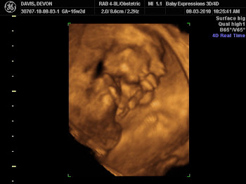 On Aug 3rd i went to a local 3D/4D Ultrasound place, just for fun and to see if i could find out if the baby was a boy or a girl. Well she was very stubborn and turned to face my back but completely adorable when we saw her pretty little face for a few seconds. And of course her hiney is cute to. I kept seeing something on her tummy but figured if something was wrong she would have said something, turns out she couldnt she isnt allowed to diagnose. The lady that runs the place got on the phone right away to my OB, she told him that during my exam she saw a defect and sent him a disc of my pictures. The dr's office called me on Aug 4th and told me that something was found and i needed to come in the next morning during walk in. They said that i may have to see maternal fetal medicine which is the high risk dr's for problems i knew then that something was very wrong and i was scared to death.